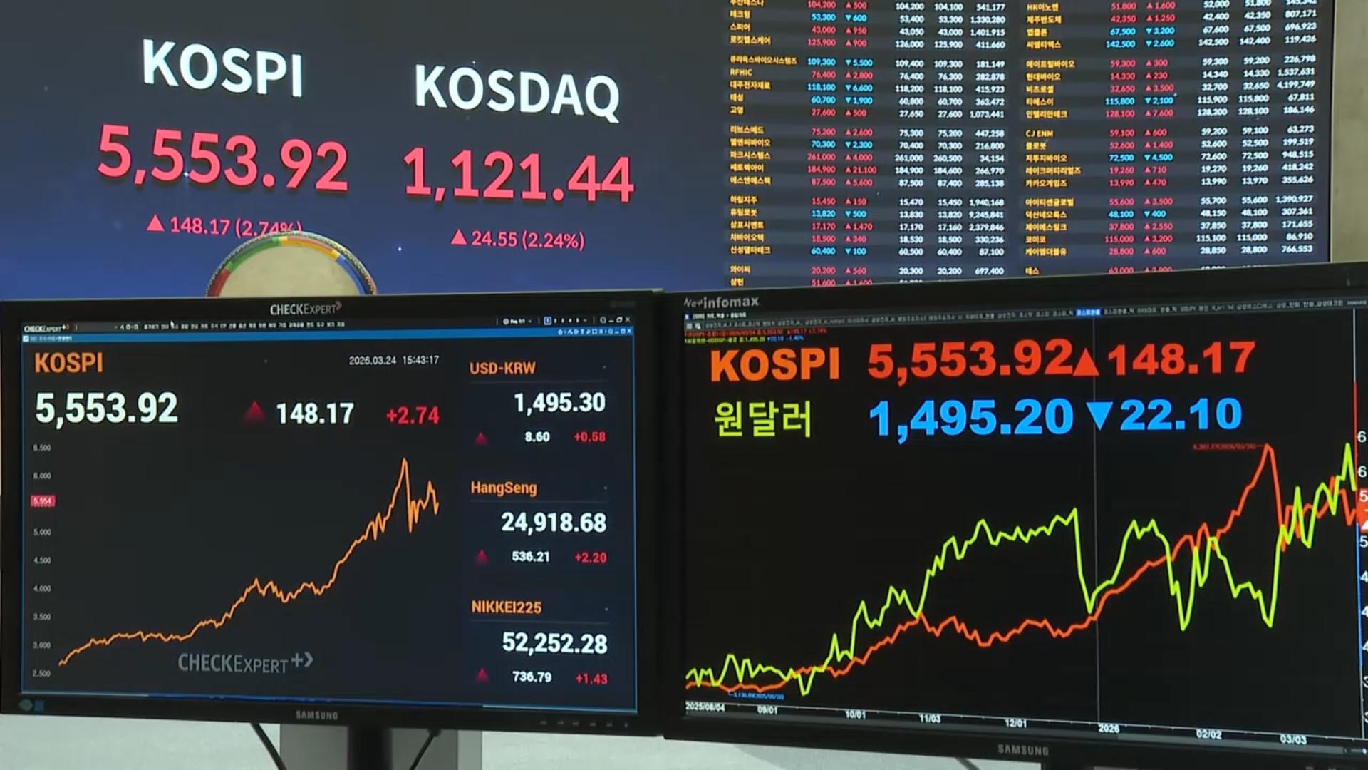 코스피 5,500선 회복…환율 1,500원 아래로