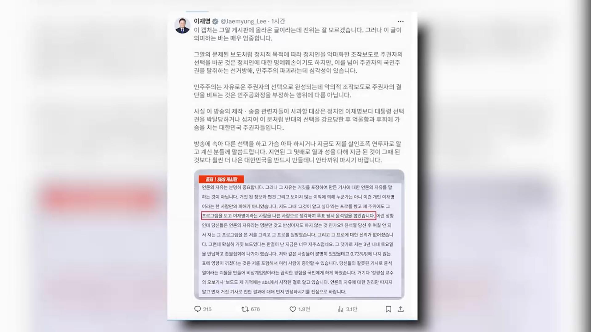 李 "정치인 악마화 조작 보도…민주주의 파괴"