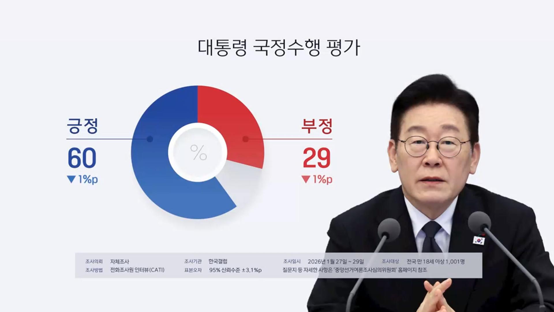 갤럽 "이 대통령 지지율 60%…민주 44%· 국힘 25%"